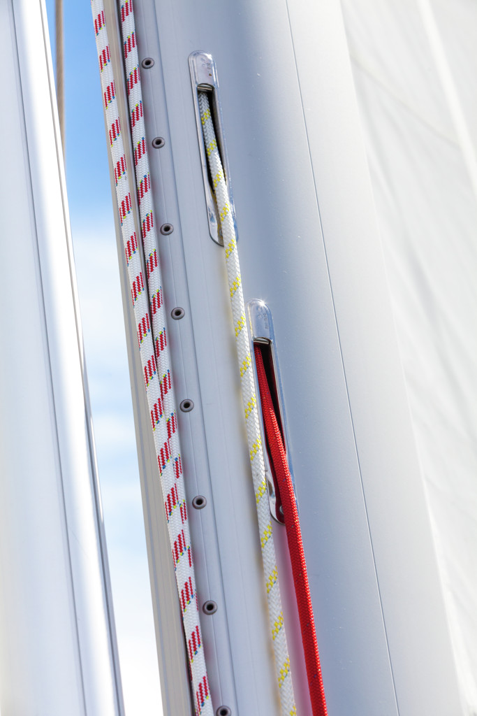 Selden Valuitgang, de naam zegt het al, de uitgang waar de val uit de mast komt. Deze sleuffittingen zoals ze ook wel worden genoemd, verminderen wrijving en voorkomen zodoende slijtage van de draadvallen op de mast.